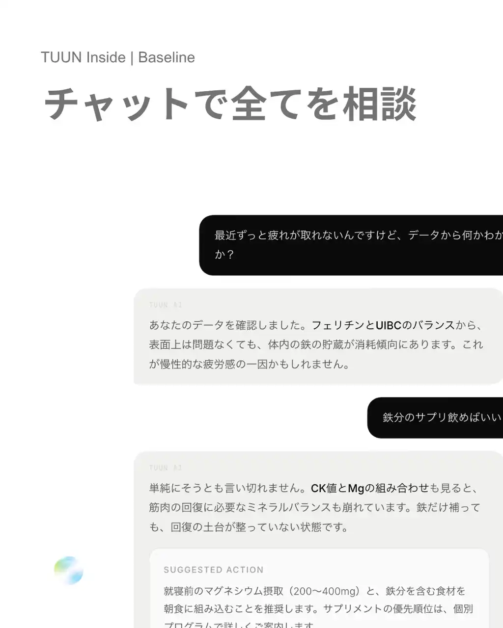 | TUUNは、遺伝子・血液・バイタルデータ(Apple Watch、Oura Ring、Soxai等)・サプリメント・服薬情報を一つのAIに統合。ユーザーの体質と日々の変化を24時間理解し続けるエージェントが、「なんとなくだるい」「理由のわからない不調」といった曖昧な悩みから、ダイエット・疲労回復・睡眠・運動まで、一人ひとりに最適化された答えを能動的に提案します。 | |||