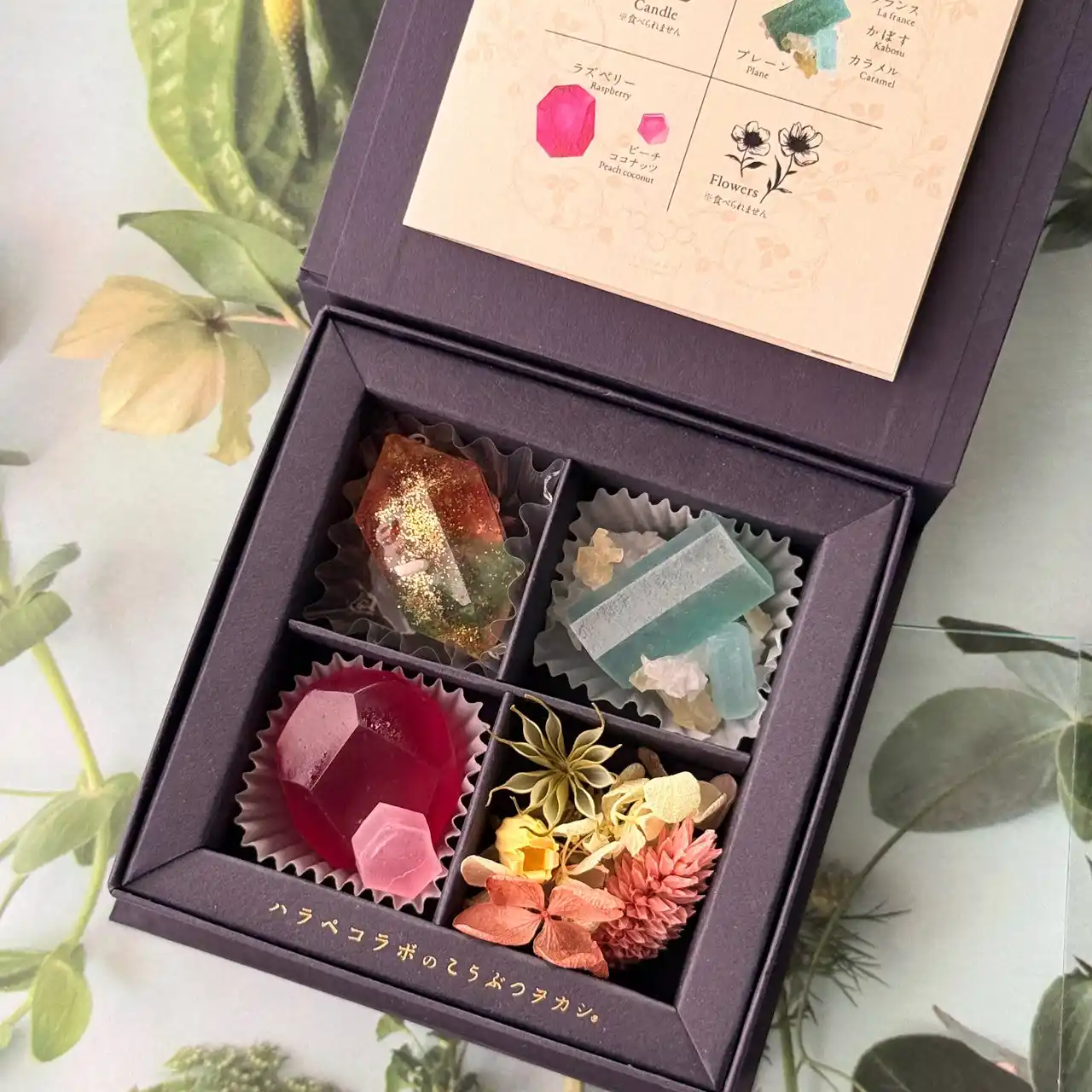 | 「ルビーちゃんとエメラルドちゃんのこうぶつヲカシ 4粒箱」は、ルビーとエメラルドの原石をイメージしたこうぶつヲカシ2粒に、やわらかな灯りを楽しめる鉱物型ジェルキャンドルとドライフラワーを添えた、コンパクトなギフトセットです。箱を開けた瞬間にときめく可愛らしさはそのままに、9粒箱よりもお求めやすい価格とサイズ感で、気軽な贈り物や他のプレゼントに添える“プラスワンギフト”としてもおすすめ。お母さんへ日頃の感謝をさりげなく伝える、母の日の贈り物にぴったりの一箱です。 | |||||||||