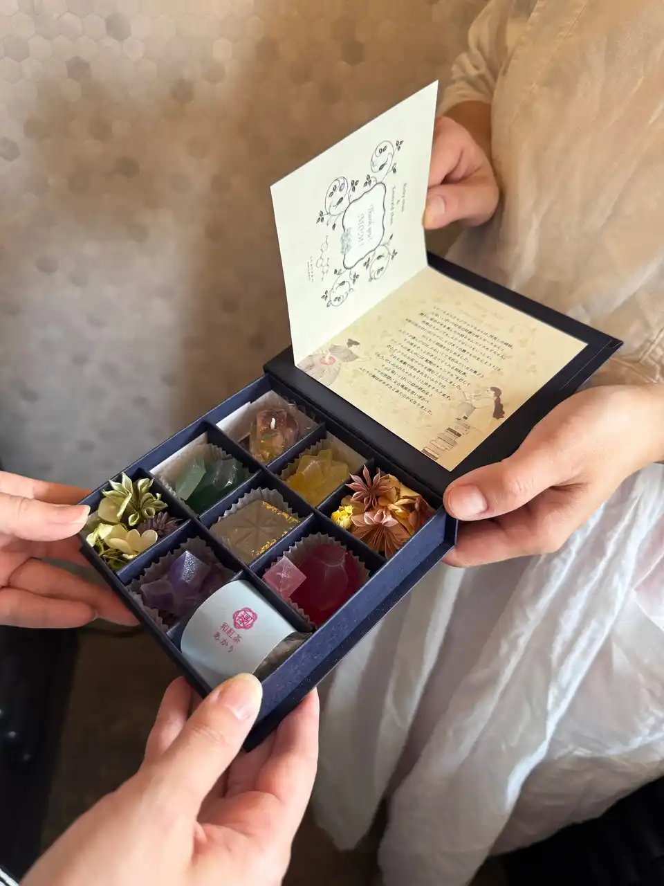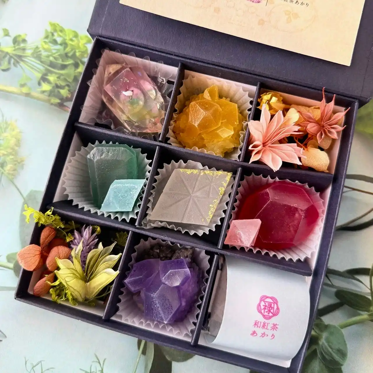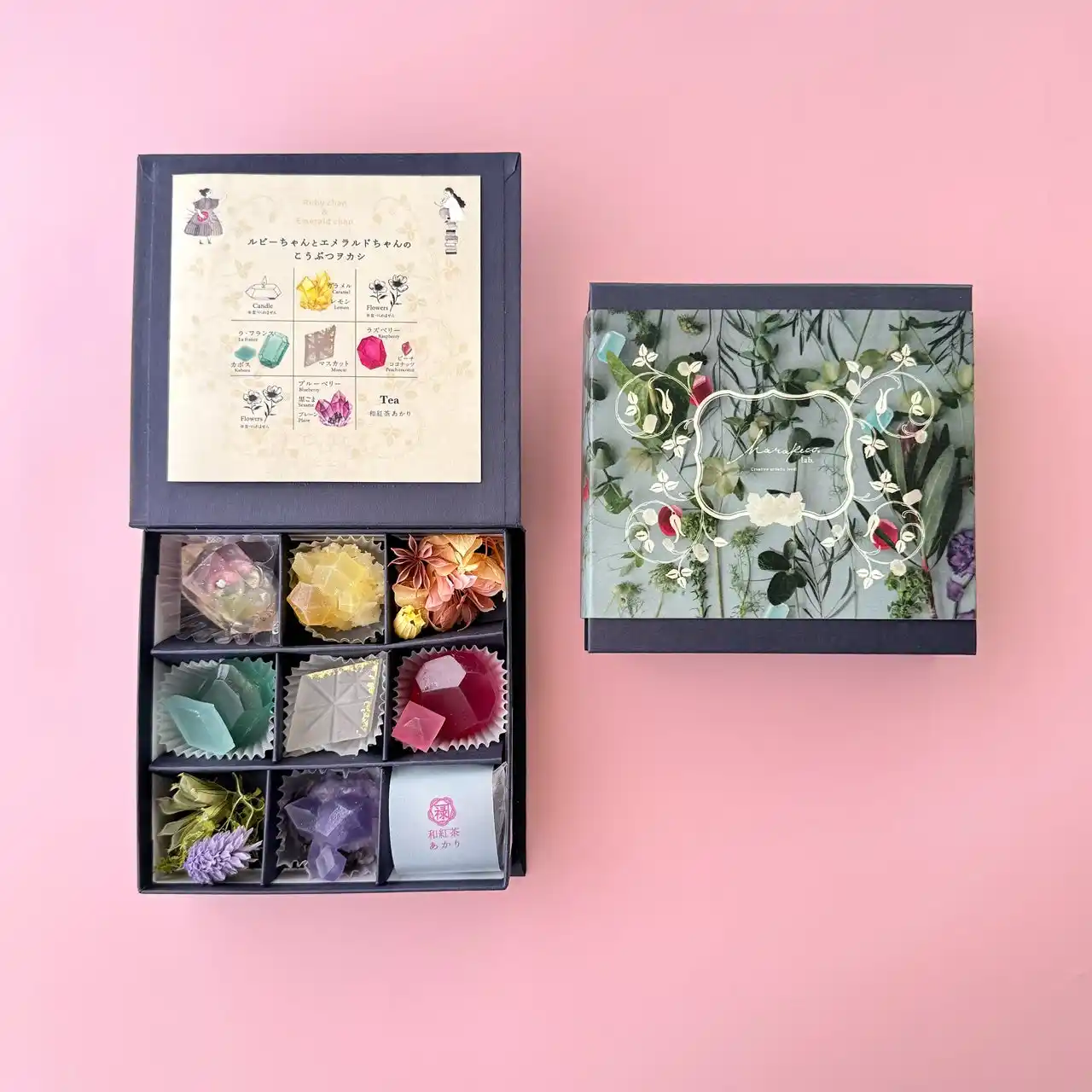 | 「ルビーちゃんとエメラルドちゃんのこうぶつヲカシ 9粒箱」は、ルビーとエメラルドを中心に、鉱物や宝石をイメージした【琥珀糖・こうぶつヲカシ】を詰め合わせました。さらに、和紅茶のティーバッグ、やさしく灯る鉱物型ジェルキャンドル、彩りを添えるドライフラワー添えて、まるで宝石箱を開けたようなときめきと、ゆったりとした癒しの時間をお届けします。ママの笑顔を思い浮かべながら、大切に詰め込んだ想いごと届ける、心あたたまる母の日ギフトです。 | |||||||||