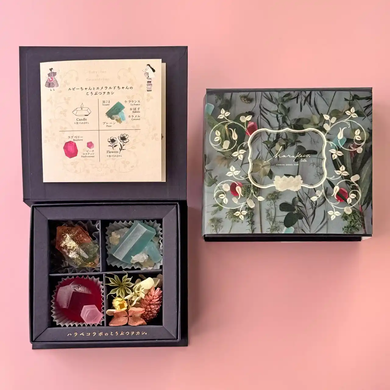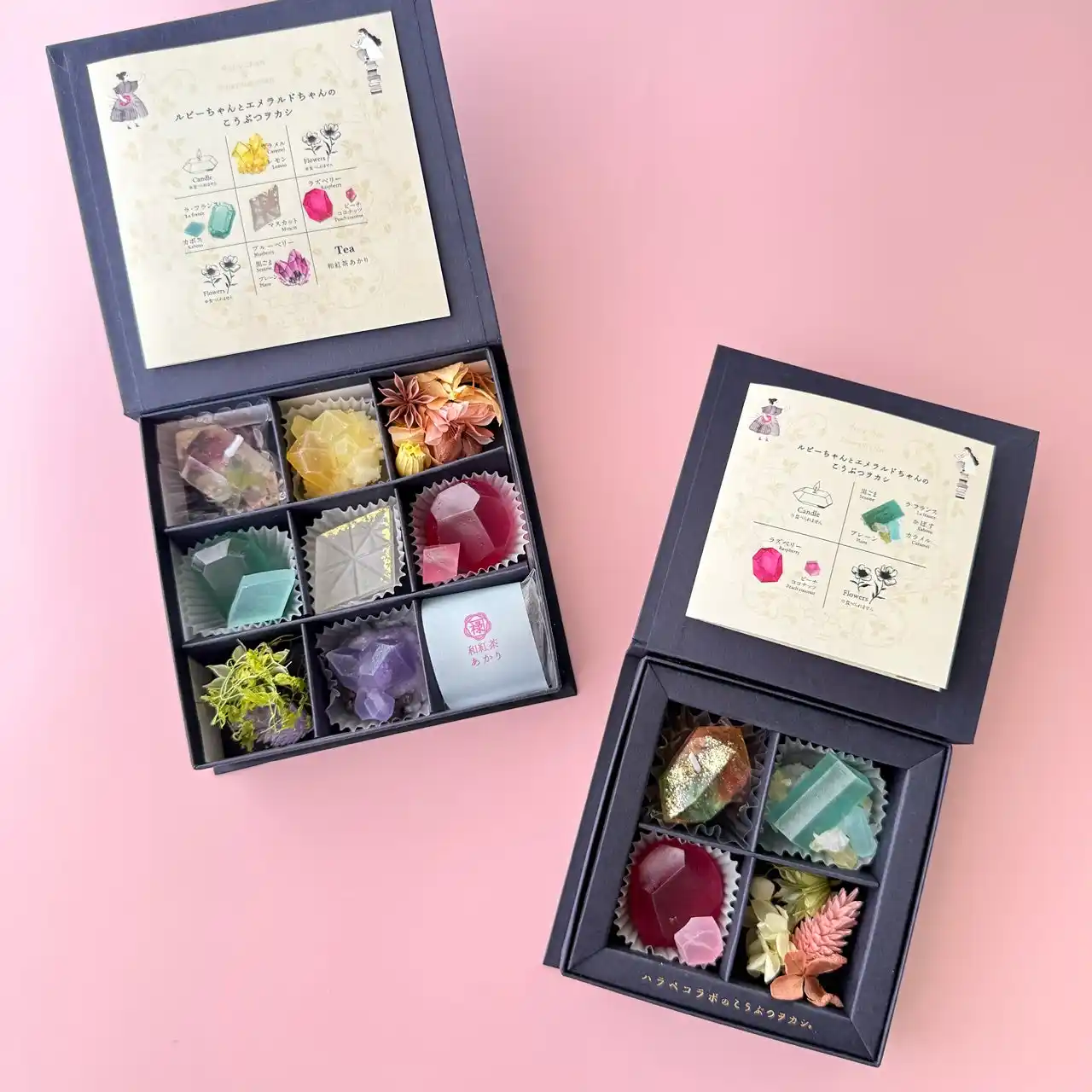 | ハラペコラボの代表作である【琥珀糖・こうぶつヲカシ】は、寒天と砂糖をベースに、リキュールや果汁で風味を加え、天然由来の着色料で色合いを表現した寒天菓子です。職人が一つ一つ小刀で切り出すことで、どれひとつとして同じもののない、鉱物や宝石の美しい造形を生み出しています。こうぶつヲカシの表面は、砂糖が結晶化することで、シャリっとした食感、中はプルンとした食感が楽しめます。まるで、宝石や鉱物を食べるような特別な体験をお届けしています。今年の母の日のテーマは、物語とともに楽しめるギフト。 元気いっぱいで好奇心旺盛な妹ルビーちゃんと、静かに星空や本を楽しむ姉エメラルドちゃん。性格の異なるふたりが、母の日に向けて心を込めて選んだ“宝石やお花”をモチーフに、「仲良しの姉妹がお母さんに贈る、とびきりのプレゼント」をお菓子やキャンドルで表現しました。 | |||||||||