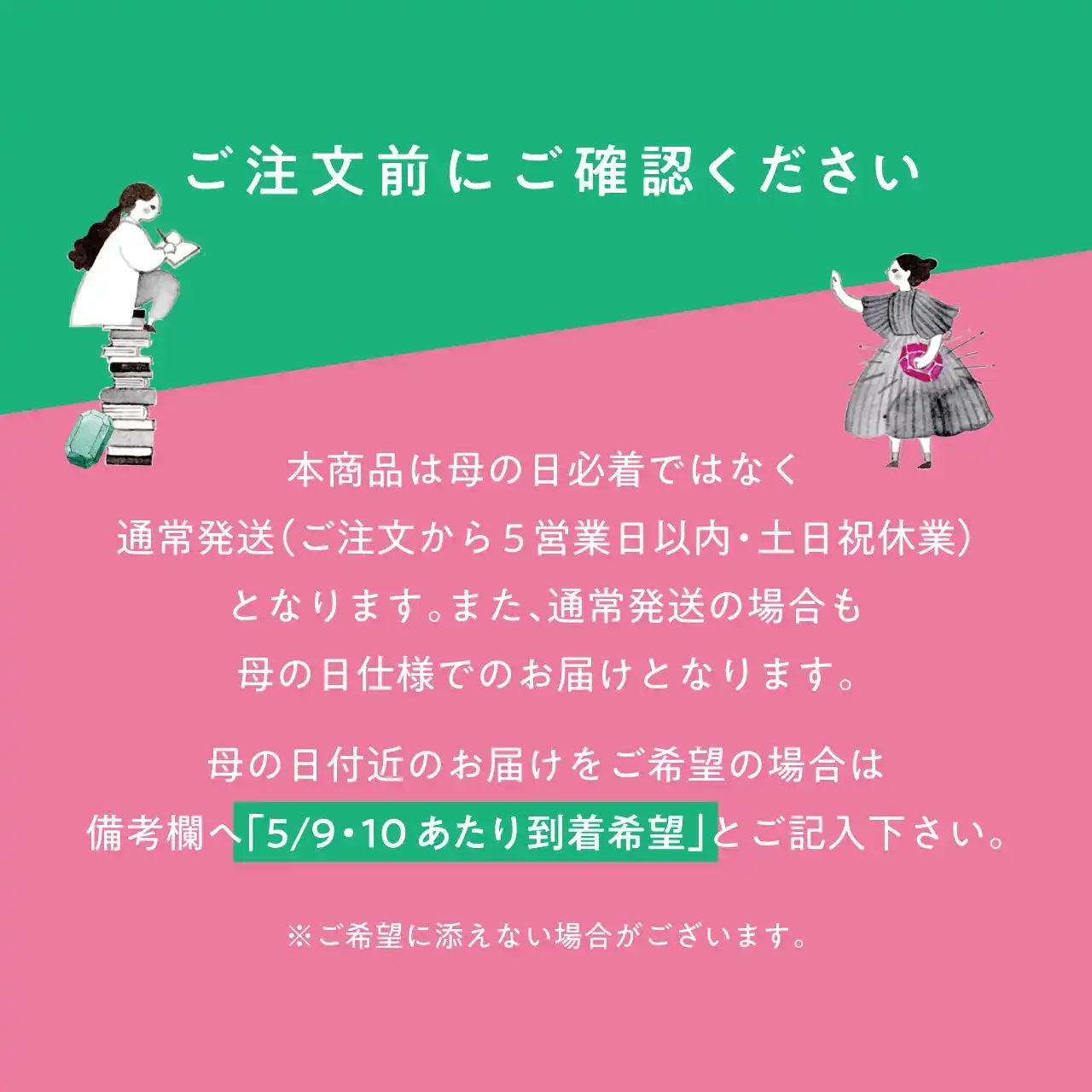母の日近辺(5/9または10)にお届けを希望される方は、注文時「備考欄」に着日のご希望をお書きください。