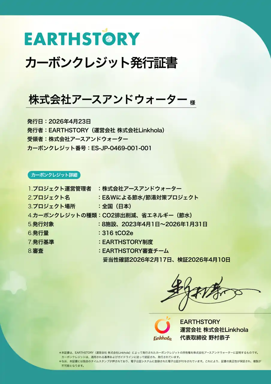 株式会社Linkhola(本社:東京都港区、代表取締役:野村恭子、以下「Linkhola」)は、株式会社アースアンドウォーター(本社:東京都江戸川区、代表取締役:山中正美、以下「アースアンドウォーター」)と共同で、国内初となる「節水・節湯」によるボランタリーカーボンクレジット創出プロジェクトにおいて(以下「ボランタリークレジット」)、この度、国内初*クレジットの発行が完了したことをお知らせいたします。*2026年4月24日自社調べ |
