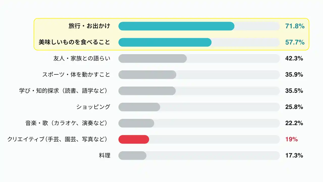 圧倒的な「外向き」志向 一生楽しみたい趣味のトップは「旅行・お出かけ(71.8%)」。シニアのイメージとして描かれがちな「手芸・園芸などのクリエイティブ」は19.0%にとどまり、シニアの関心が強く「外(体験)」に向かっていることが判明。 |