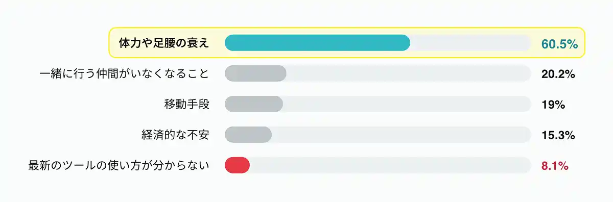 最大の恐怖は身体的な衰え 楽しみを阻む不安要素のトップは「体力や足腰の衰え(60.5%)」。対して、「最新ツールの使い方がわからない」というデジタル不安はわずか8.1%と、全項目で最低水準に。 |
