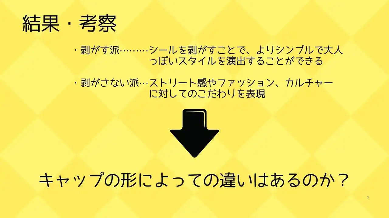 この授業内で学生が実際に企画・データ分析した成果から、特に優秀と評価したレポートをシリーズで公開します。2026年第2弾のテーマは「キャップのシール、剥がす? 剥がさない?」です。ZOZO・Instagramから収集したデータを情報ソースとして、様々な観点からデータに基づいた分析が行われています。 |