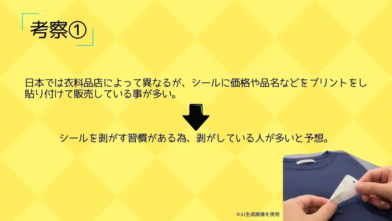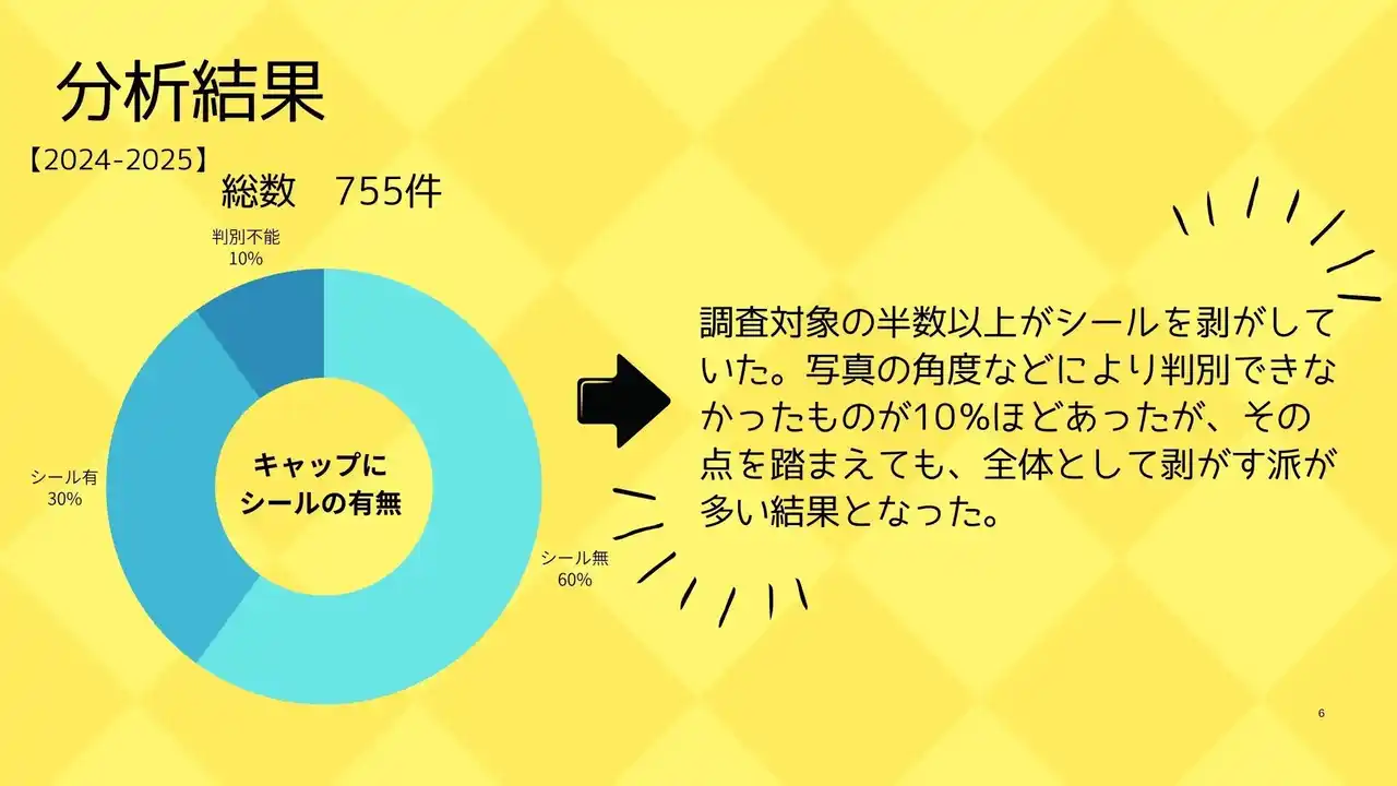 キャップのシールを剥がすか剥がさないか。服飾学生が休憩時間に繰り広げていそうな論争のテーマに「らしさ」を感じるとともに、それを数値的に解明しようとする取り組みがとても面白いと思います。 |