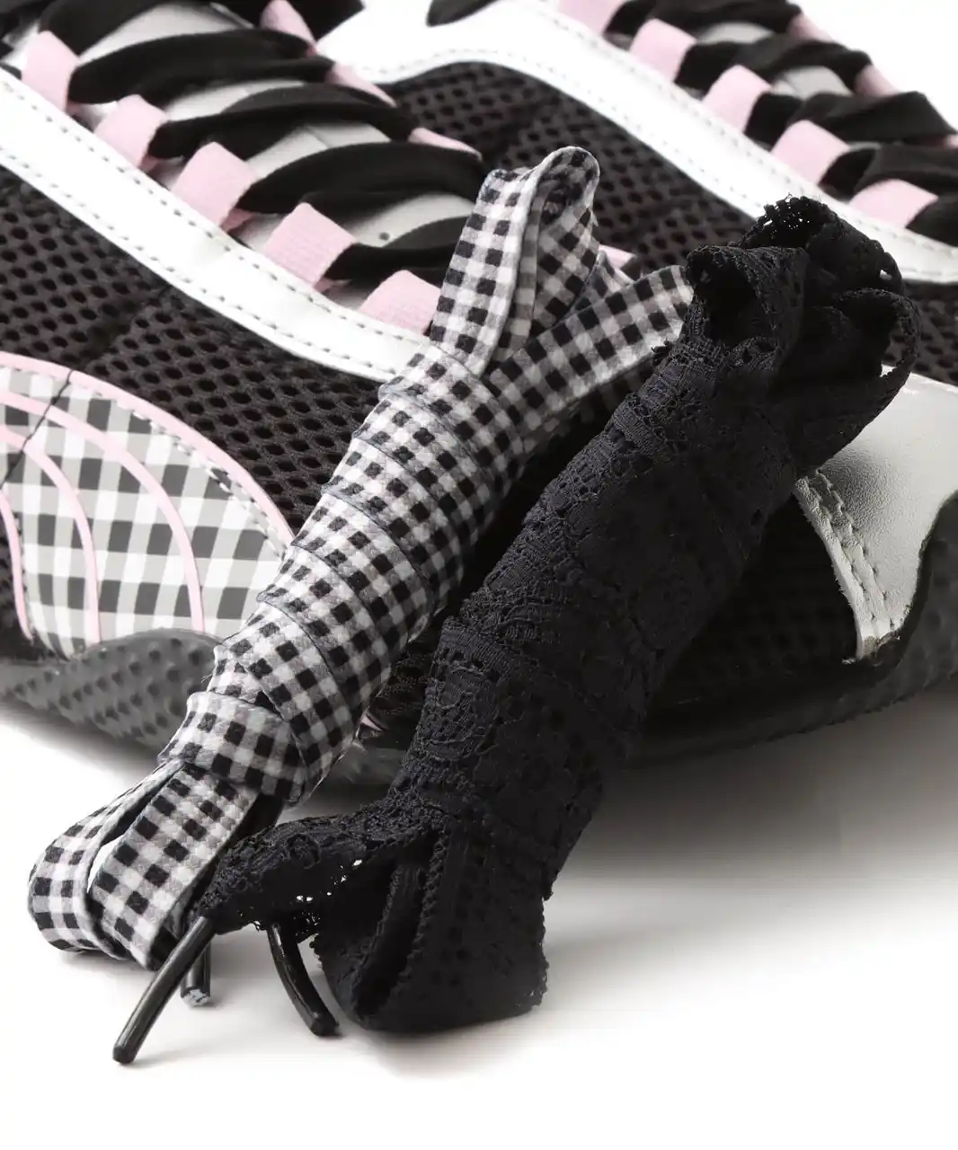 セットされているシューレースはブラックのほかに、レースタイプとギンガムチェックの3種が用意されており、様々なアレンジや、スタイルの気分によって楽しんでいただけます。 |
