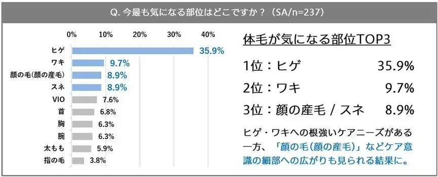 意外な新事実!王道ともいえるヒゲ・ワキ・スネに加え、最も体毛が気になる部位TOP3に「顔の毛(顔の産毛)」がランクイン