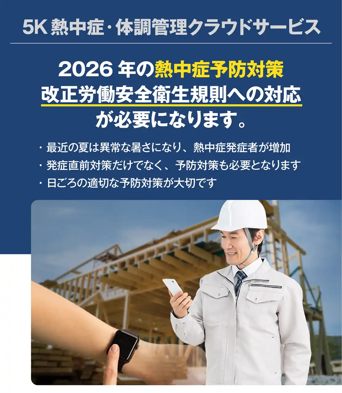 | 5Kサポート株式会社(本社:横浜市、代表:中野吉雅)は、提供する「5K熱中症・体調管理クラウドサービス」について、今季の繁忙期を前に引き合いが拡大する中、大手ゼネコンでのテスト導入が決定したことをお知らせします。 | |||