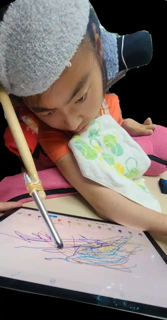 手に拘縮があり、筆などを手で握って描くことが難しいため、本人と相談して |