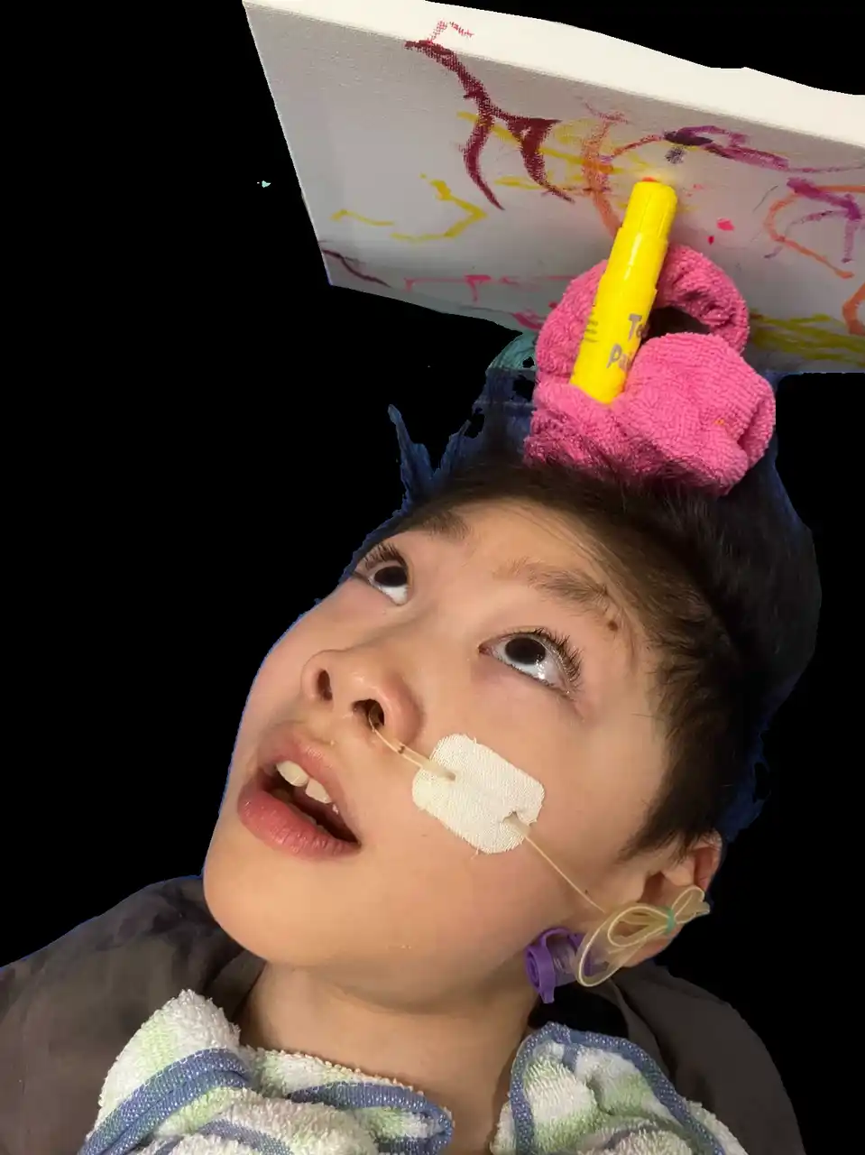 頭に筆をつけて描くことで、本人も自由に表現ができるようになりました。 |