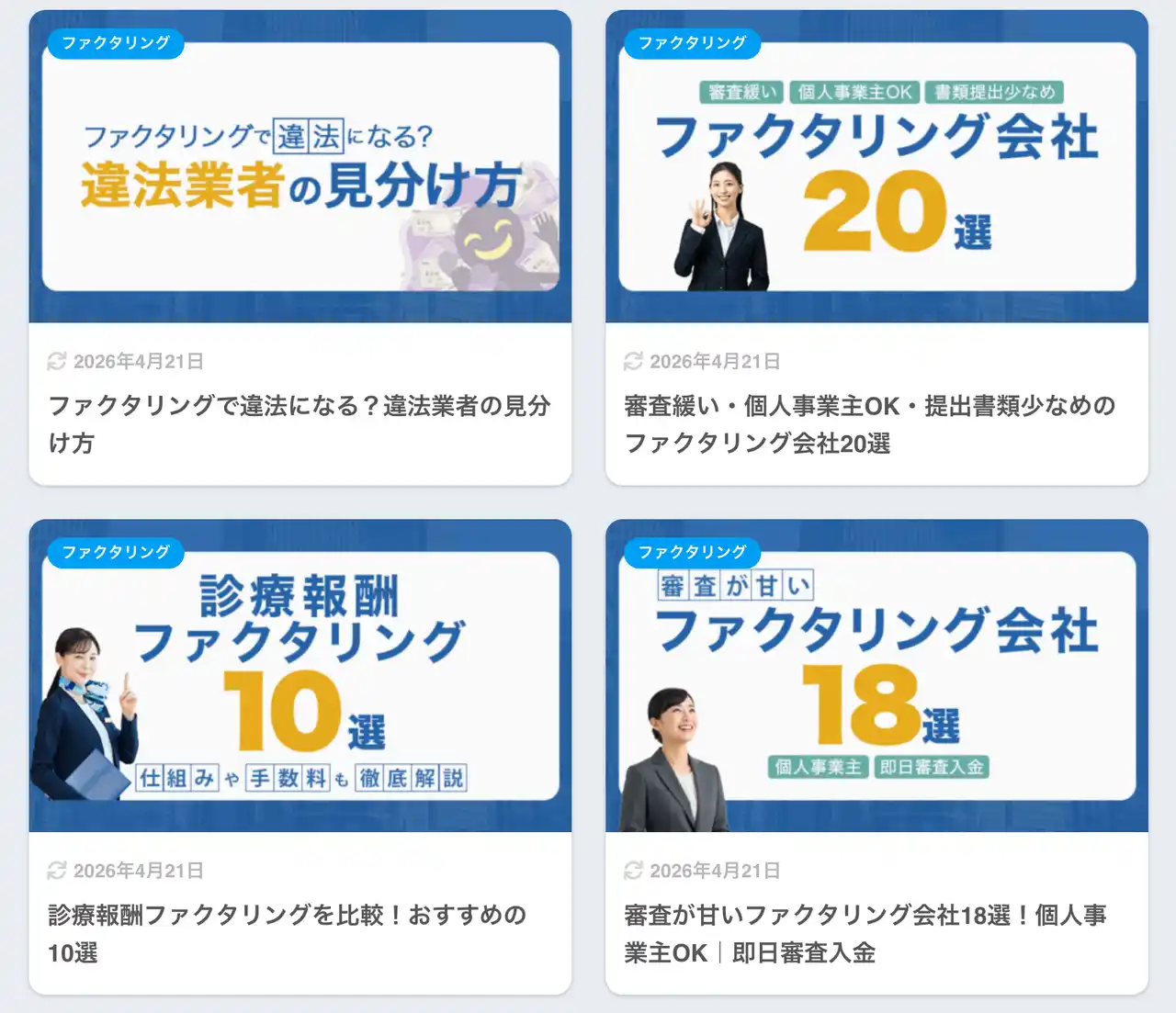 「ファクタリングガイド」では、こうした分析結果をもとに、以下のようなコンテンツを提供しています。 |