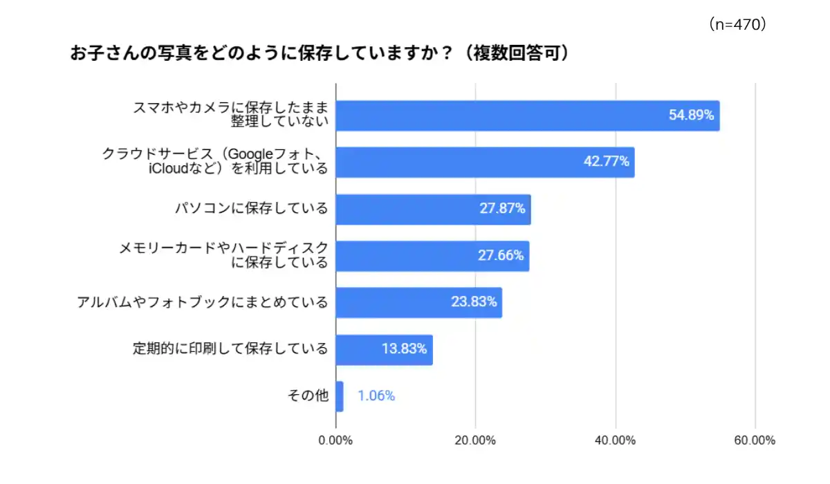お子さんの写真をどのように保存しているか尋ねたところ、最も多かったのは「スマホやカメラに保存したまま整理していない」で54.89%という結果になりました。次いで「クラウドサービス(Googleフォト、iCloudなど)を利用している」が42.77%、「パソコンに保存している」が27.87%、「メモリーカードやハードディスクに保存している」が27.66%と続きます。一方で、「アルバムやフォトブックにまとめている」は23.83%、「定期的に印刷して保存している」は13.83%に留まりました。日々気軽に撮影できるからこそ、膨大なデータがそのまま溜まってしまっているご家庭が多いようです。 |