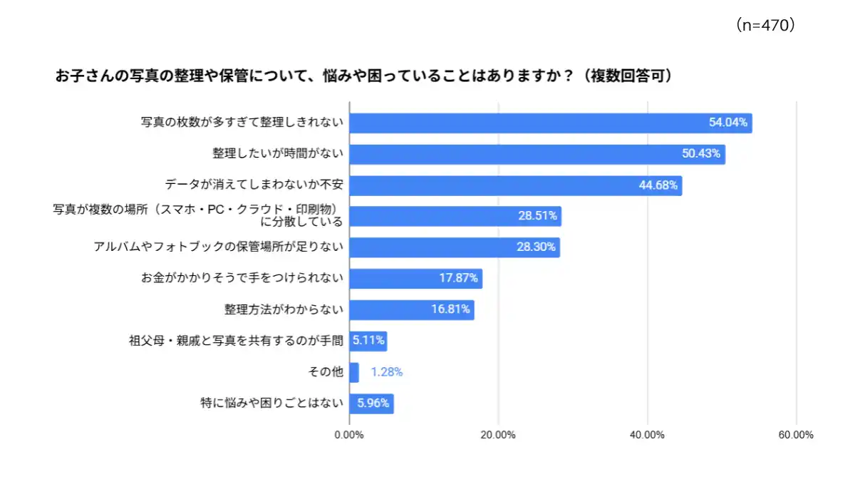 写真の整理や保管についての悩みを聞くと、トップは「写真の枚数が多すぎて整理しきれない」で54.04%、僅差で「整理したいが時間がない」が50.43%となりました。3位以降にも「データが消えてしまわないか不安(44.68%)」、「写真が複数の場所に分散している(28.51%)」、「アルバムやフォトブックの保管場所が足りない(28.30%)」といった回答が続き、94%の方が何らかの悩みを抱えていることがわかりました。