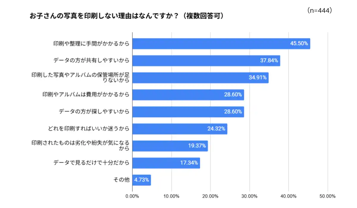 一方、写真を印刷しない理由としては、「印刷や整理に手間がかかるから(45.50%)」が最も多く、次いで「データの方が共有しやすいから(37.84%)」、「印刷した写真やアルバムの保管場所が足りないから(34.91%)」、「印刷やアルバムは費用がかかるから(28.60%)」といった理由が挙げられています。自由回答を見ても、「写真をたくさん撮るので、印刷するのに時間がかかり追いついていないこと。