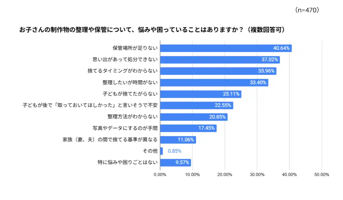 制作物の整理や保管における具体的な悩みは、「保管場所が足りない」が40.64%でトップでした。次いで「思い出があって処分できない(37.02%)」、「捨てるタイミングがわからない(35.96%)」、「整理したいが時間がない(33.40%)」など、整理したいと思いつつ、感情的にためらわれたり、忙しくてできない、という方が多くいらっしゃいました。また、「子どもが捨てたがらない(25.11%)」、「子どもが後で『取っておいてほしかった』と言いそうで不安(22.55%)」も2割以上の回答を集めるなど、作り手であるお子さんの気持ちを大切にしている様子もうかがえます。 |
