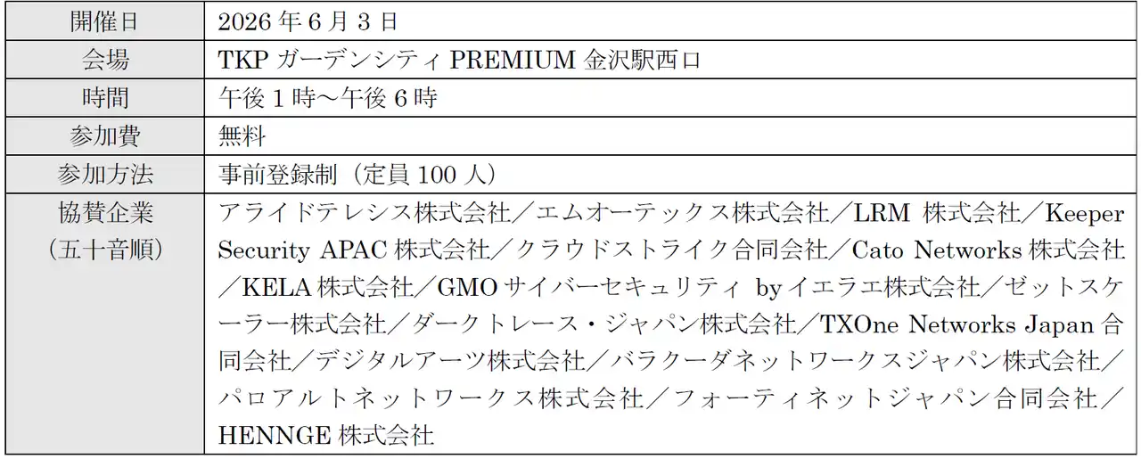https://licensecounter.jp/cyber-security/events/meetup-hokuriku2026/ |