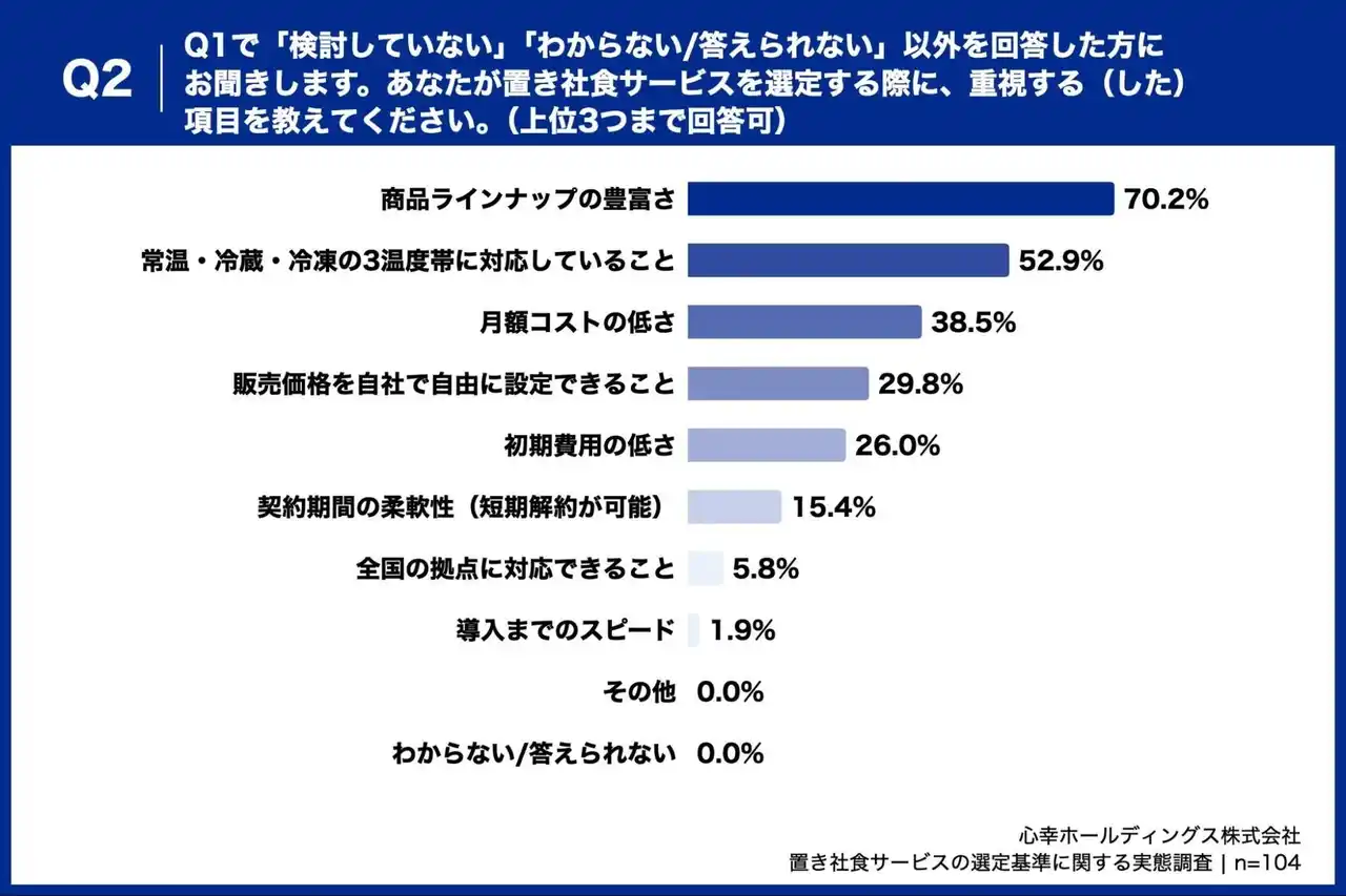 「Q2. Q1で「検討していない」「わからない/答えられない」以外を回答した方にお聞きします。あなたが置き社食サービスを選定する際に、重視する(した)項目を教えてください。(上位3つまで回答可)」(n=104)と質問したところ、「商品ラインナップの豊富さ」が70.2%、「常温・冷蔵・冷凍の3温度帯に対応していること」が52.9%、「月額コストの低さ」が38.5%という回答となりました。 |