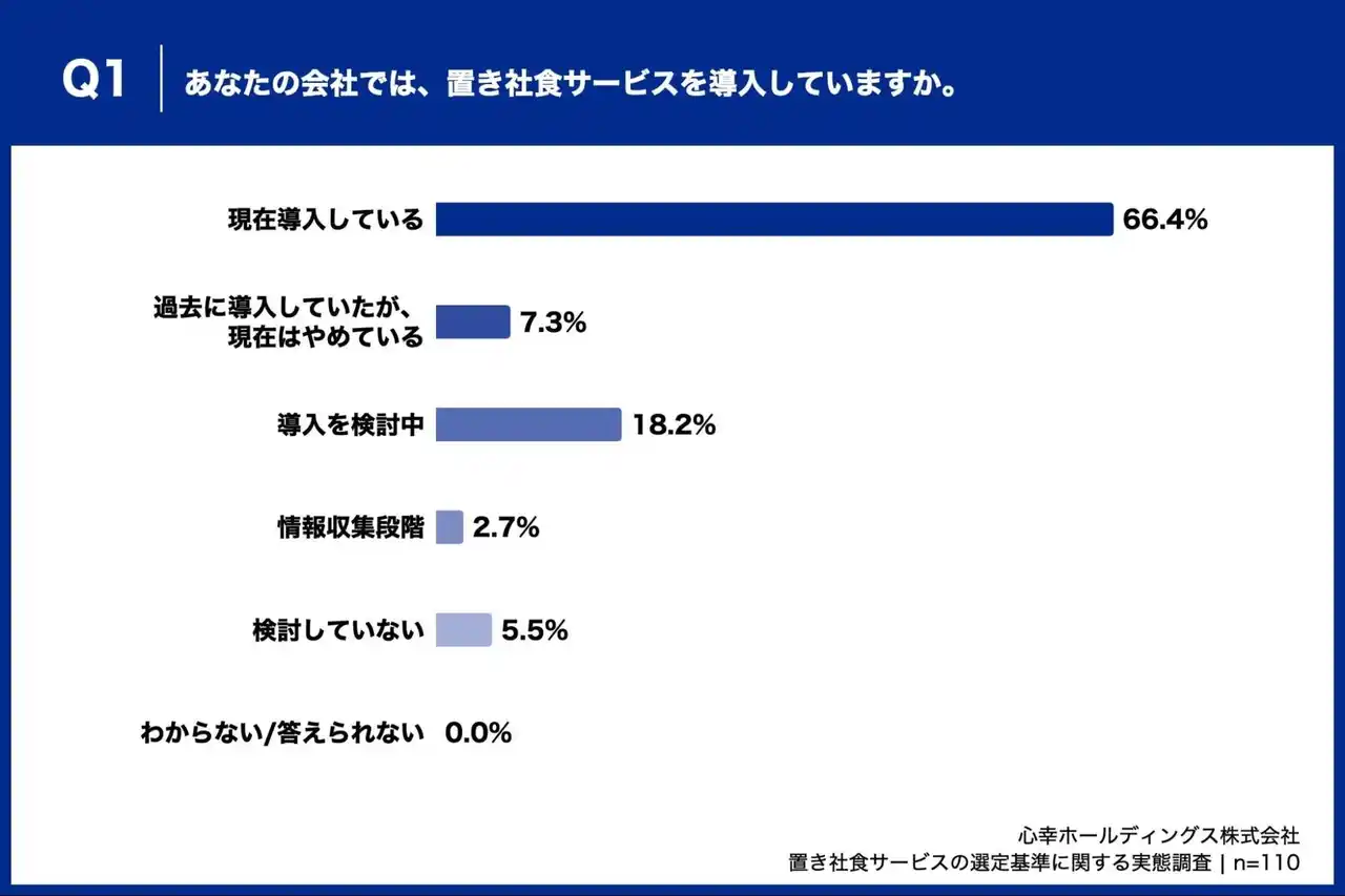 「Q1. あなたの会社では、置き社食サービスを導入していますか。」(n=110)と質問したところ、「現在導入している」が66.4%、「導入を検討中」が18.2%という回答となりました。 |