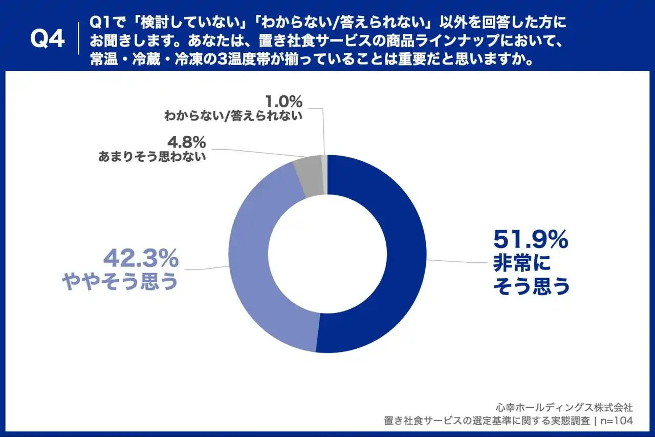 「Q4. Q1で「検討していない」「わからない/答えられない」以外を回答した方にお聞きします。あなたは、置き社食サービスの商品ラインナップにおいて、常温・冷蔵・冷凍の3温度帯が揃っていることは重要だと思いますか。」