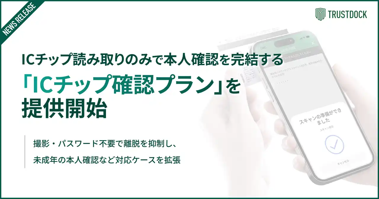 株式会社TRUSTDOCK(本社:東京都中央区、代表取締役:千葉 孝浩)は、eKYC(オンライン本人確認)サービス「TRUSTDOCK」において、ICチップ読み取りのみで本人確認を完結できる「ICチップ確認プラン」を提供開始しました。 |