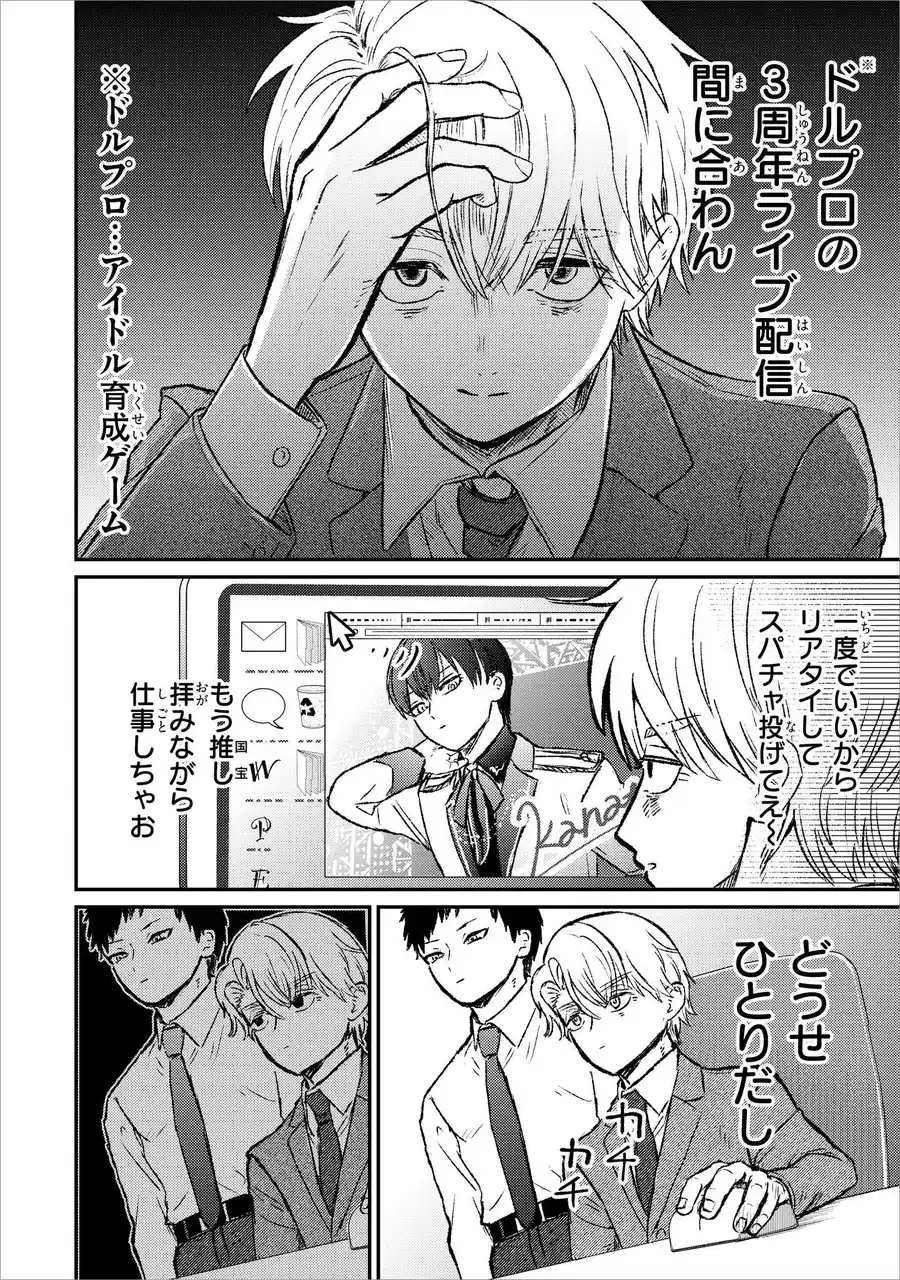 | 社畜生活に疲れきった受田怜(うけだ れい)の唯一の癒やしは、アイドル育成ゲーム「ドルプロ」の最愛の推し・早乙女奏斗(さおとめ かなと)。 | |||||||||