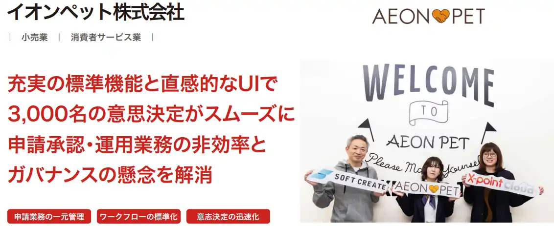 ワークフローシステムのリーディングカンパニーである株式会社エイトレッド(本社:東京都渋谷区、代表取締役社長:岡本康広 以下、エイトレッド)が提供するクラウド型ワークフロー「X-point Cloud(エクスポイントクラウド)」をご利用いただいている、イオンペット株式会社(所在地:千葉県市川市、代表取締役:米津 一郎)の導入事例を公開いたしました。 |