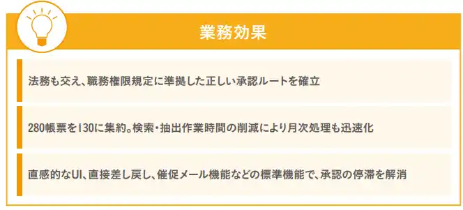 また、職務権限規定に基づいた正しい承認ルートがシステム上で担保され、不備申請の差し戻しや承認の停滞が大幅に減少。承認スピードの向上により、経営層から現場までを含めた意思決定の迅速化につながっています。 |