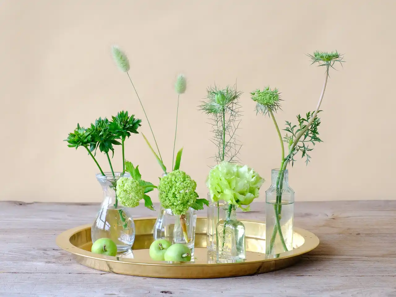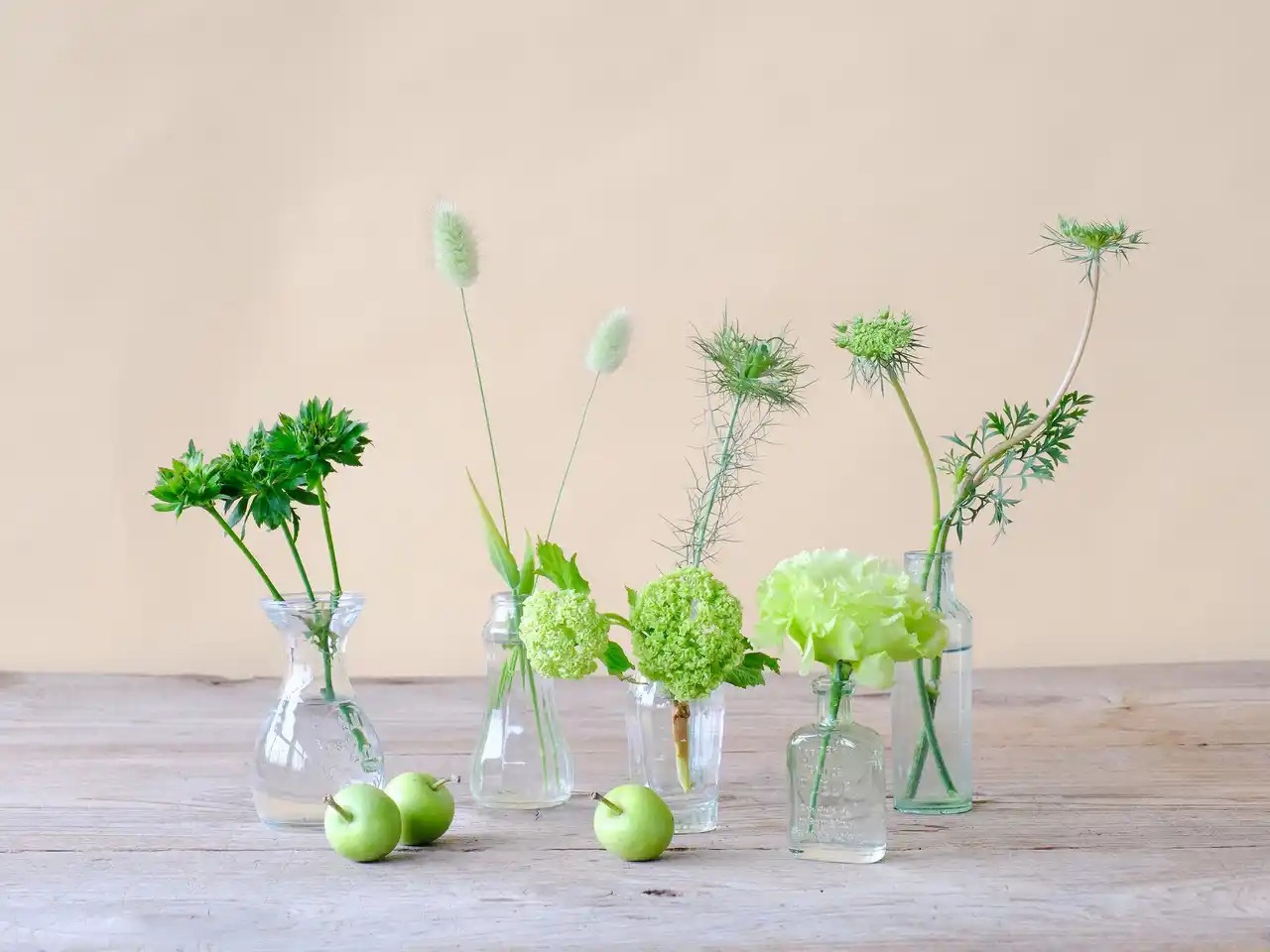 空き瓶に1~2輪の緑の小花を。花の高さをあえて揃えないほうが、ナチュラルで素敵に仕上がります。 |