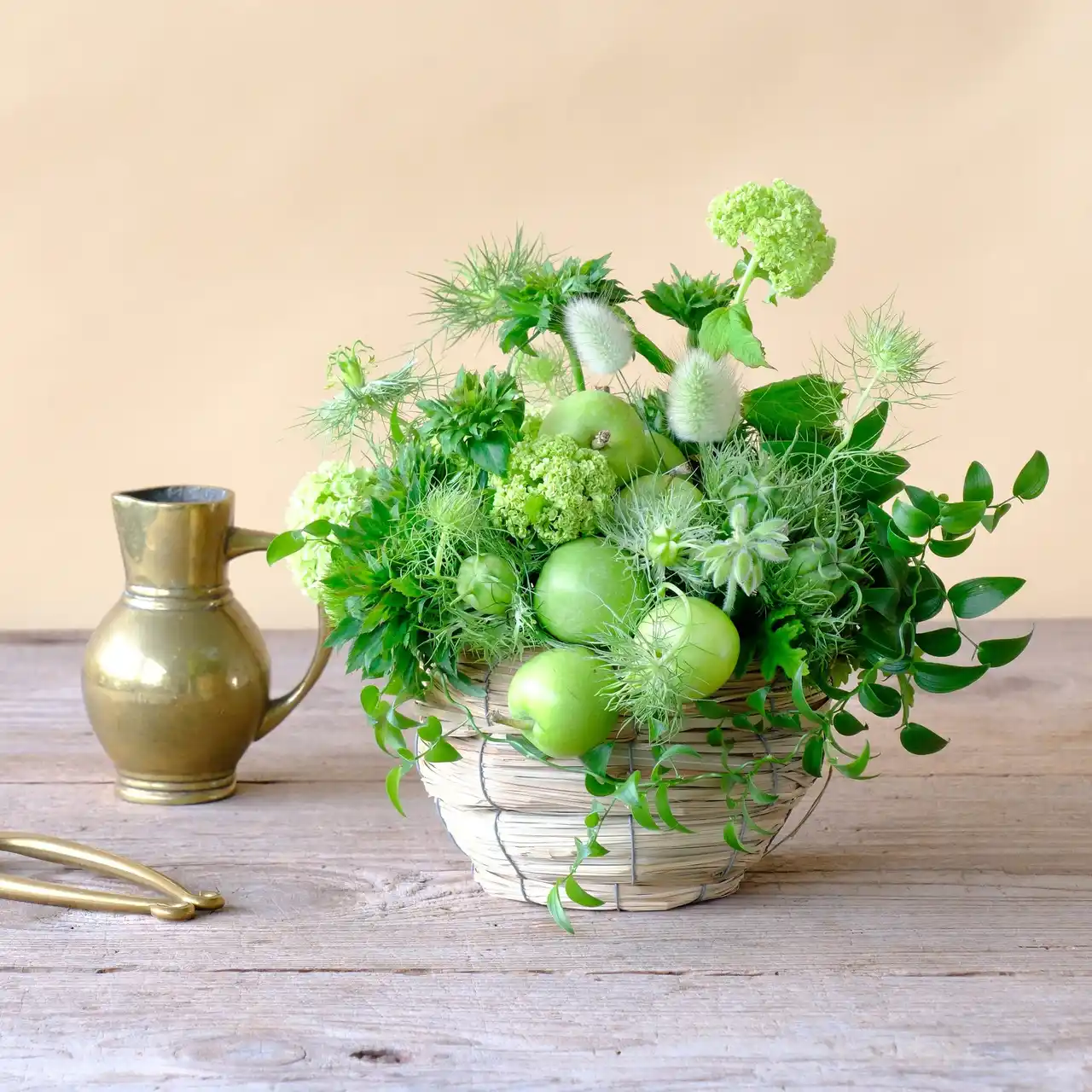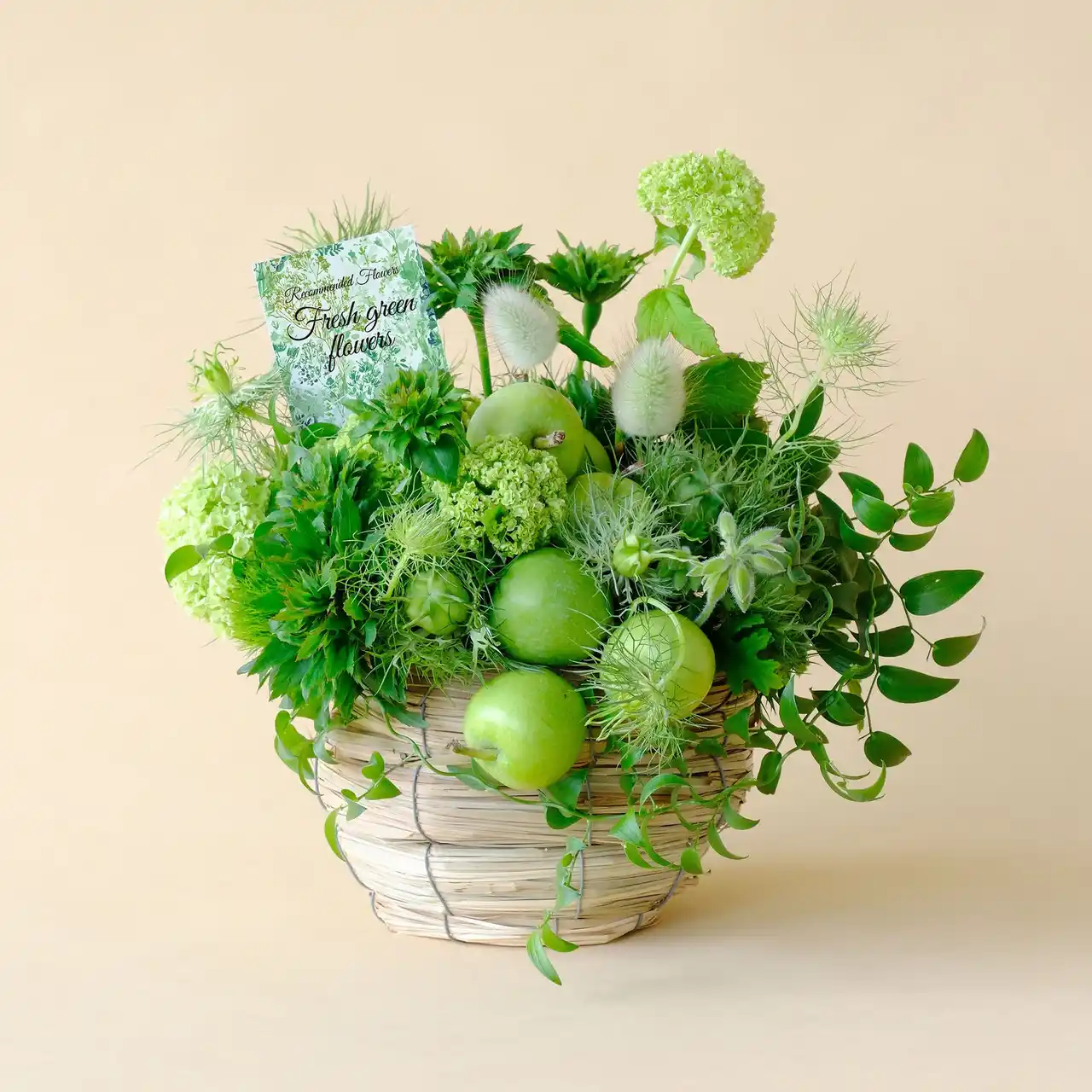ショップおすすめの新緑色の花々をナチュラルなアレンジメントに仕上げました。器付きでそのまま飾って楽しめます。 |