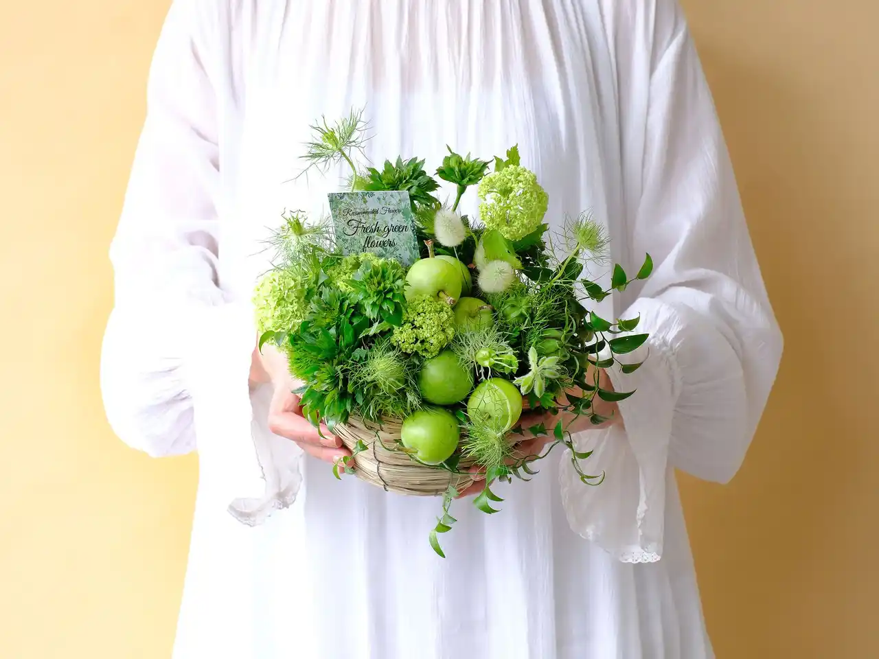 自分のために、そして大切な人への贈り物として、この時季ならではの「新緑色の花々」を取り入れてみてほしいと思います。 |