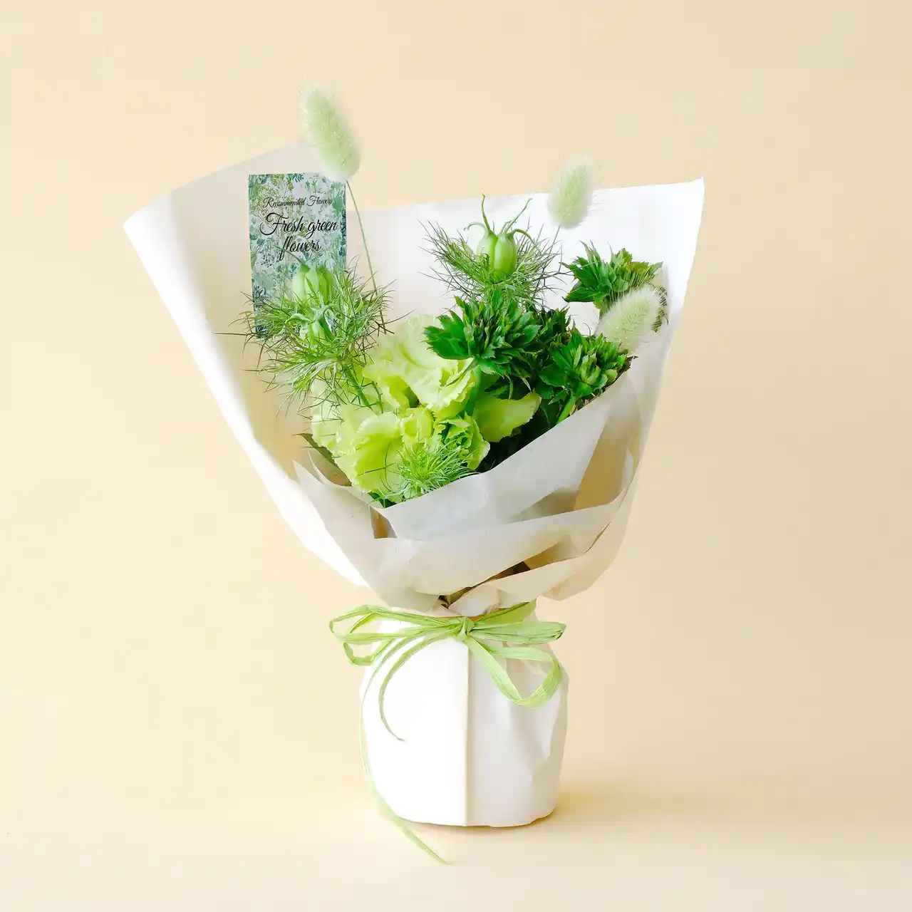 ショップおすすめの新緑色の花々をシンプルなブーケに仕上げました。コンパクトなサイズでちょっとしたギフトやご自宅用にもおすすめです。 |