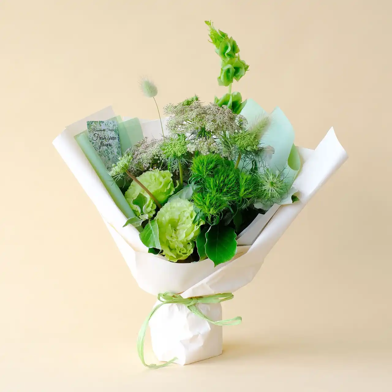 ショップおすすめの新緑色の花々を程よいボリュームのブーケに仕上げました。季節の贈り物におすすめです。 |