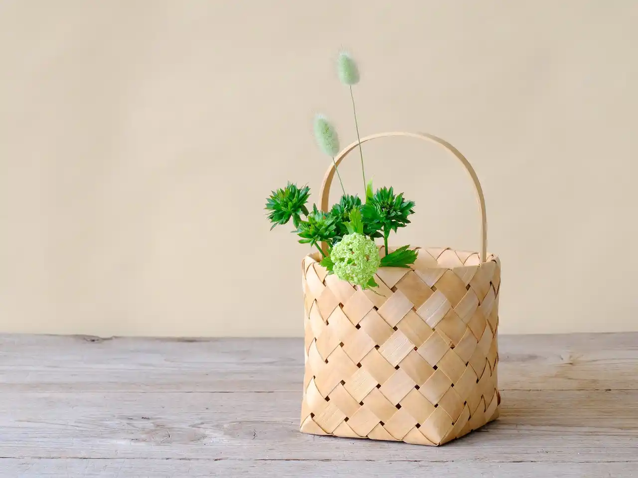 コップにいけた花をカゴに入れるだけで、ナチュラルな花あしらいに。カゴバッグや帽子など、身近なアイテムを使うのもおすすめです。 |