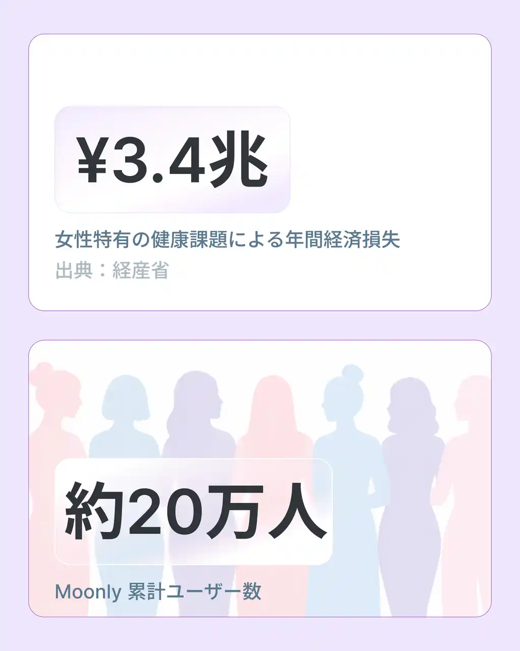 Moonly - コンシューマー向けAIヘルスケアアプリ。月経・排卵予測、妊活サポート、妊娠期のケアなど、女性のライフステージに応じた機能を提供。約20万人のユーザーから蓄積されたデータを有し、様々な業界で利活用しています。 |