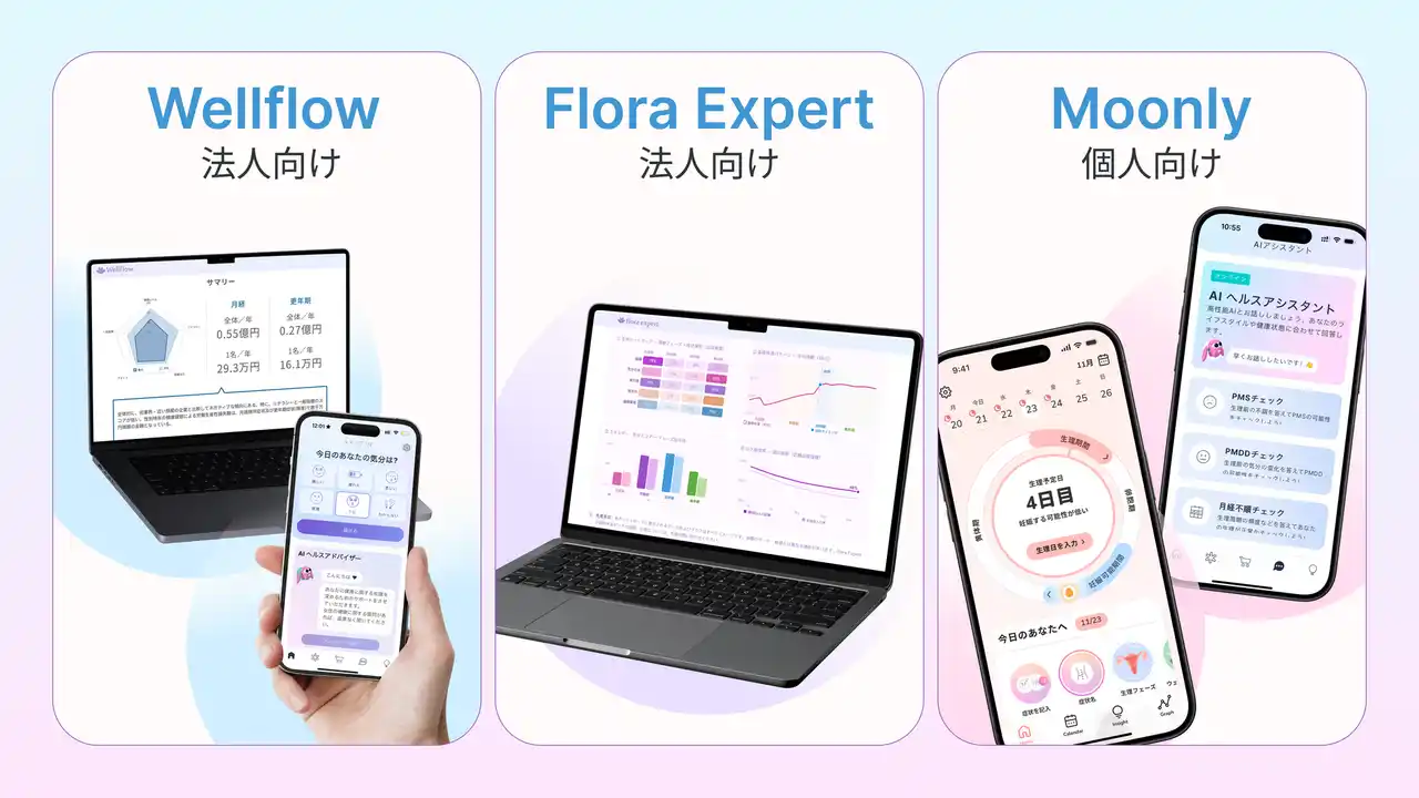 Floraは、この「ジェンダーデータギャップ」をAIとデータの力で埋めることをミッションに掲げる、京都発のフェムテックスタートアップです。コンシューマー向けアプリで蓄積した約20万人のユーザーデータと独自のAIアルゴリズムを基盤に、法人向けフェムテックサービス(女性従業員のWell-being支援)「Wellflow」、法人向け事業開発・サービス開発支援「Flora Expert」、そして個人向けのヘルスケアアプリ「Moonly」を展開してまいりました。 |