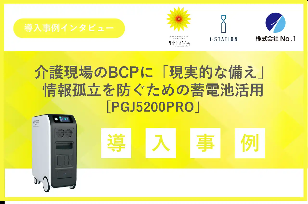 株式会社No.1(本社:東京都千代田区、代表取締役:辰巳崇之、東証スタンダード:3562、以下:当社)のグループ会社である株式会社アイ・ステーション(本社:東京都豊島区、代表取締役:執行 健太郎、以下:IST)が提供する蓄電池が、介護事業を展開する株式会社 はなひろ(本社:福島県須賀川市、代表取締役:塙 啓之、以下:はなひろ)に導入されました。 |