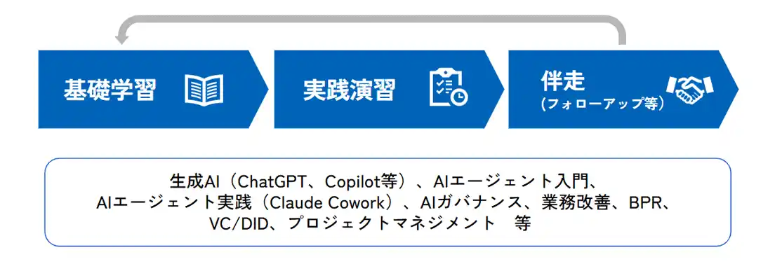 また、2025年12月に閣議決定された「人工知能基本計画」においても、AI利活用・AIガバナンス・AIとの協働を担うAI人材の育成が企業の急務として位置づけられており、単発研修では対応しきれない中長期の人材育成戦略が求められています。 |