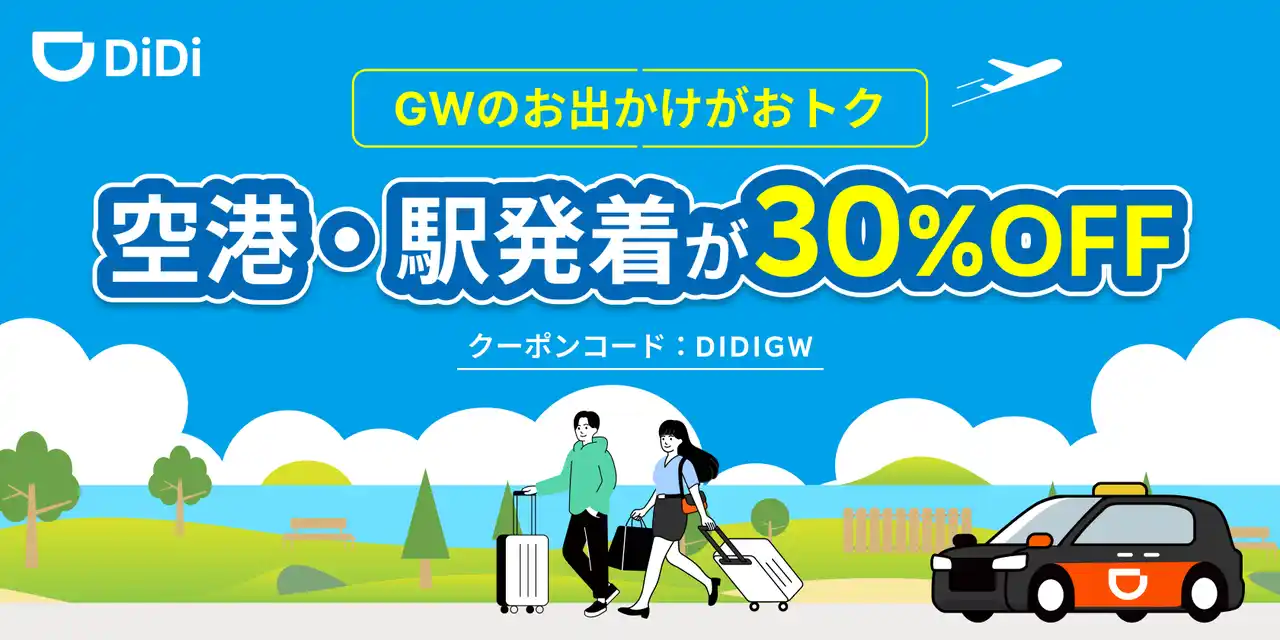 DiDiモビリティジャパン株式会社(東京都港区、代表取締役社長:和久山 大輔)は、2026年4月27日(月)より、ゴールデンウィーク期間中の移動をよりおトクにお楽しみいただくため、キャンペーンを開始します。旅行や帰省などで空港や駅の利用が増えるこの時期に、大荷物や大人数での移動の際は、ぜひDiDiをご利用ください。 |