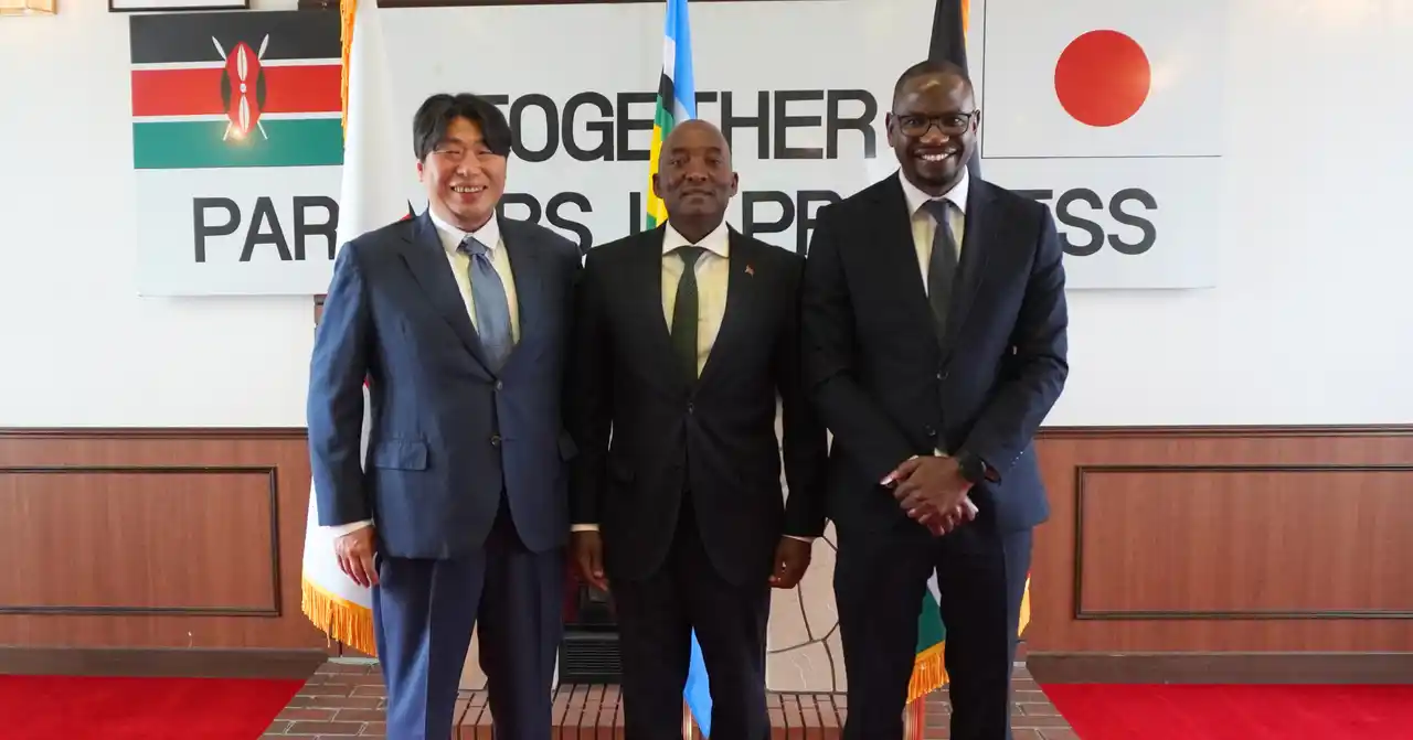 左から:Looop 代表取締役社長 CEO中村創一郎、駐日ケニア大使Mr. Moi Lemoshira、Bboxxケニア社 マネージングディレクターMr. Anthony Mabonga |
