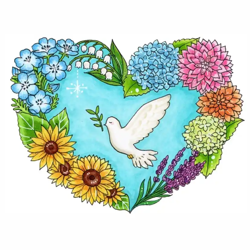 中央には、平和の象徴である白い鳩をデザインしました。 |
