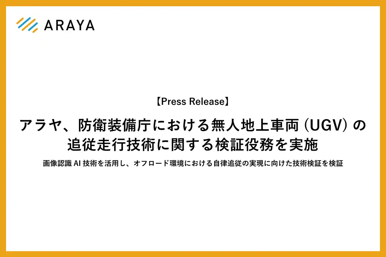 株式会社アラヤ(本社:東京都千代田区、代表取締役:金井良太)は、防衛装備庁陸上装備研究所より「追従走行検討役務」を受注し、必要な検証作業を実施したことをお知らせいたします。 |