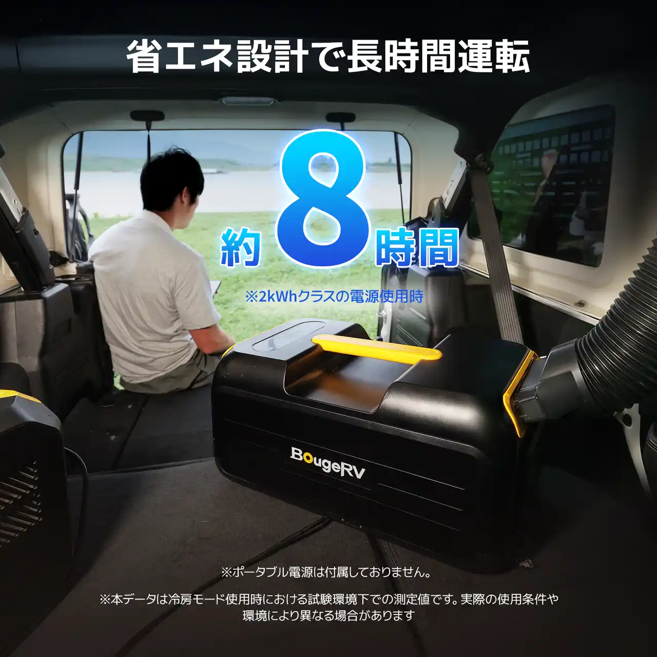 2000Whクラスの大容量ポータブル電源と組み合わせることで、連泊キャンプでも安心のスタミナを発揮します。冷房モードでは最長連続8時間の稼働が可能。電源の確保が難しいオフグリッドな環境でも、途切れることのない涼しさを提供します。 |