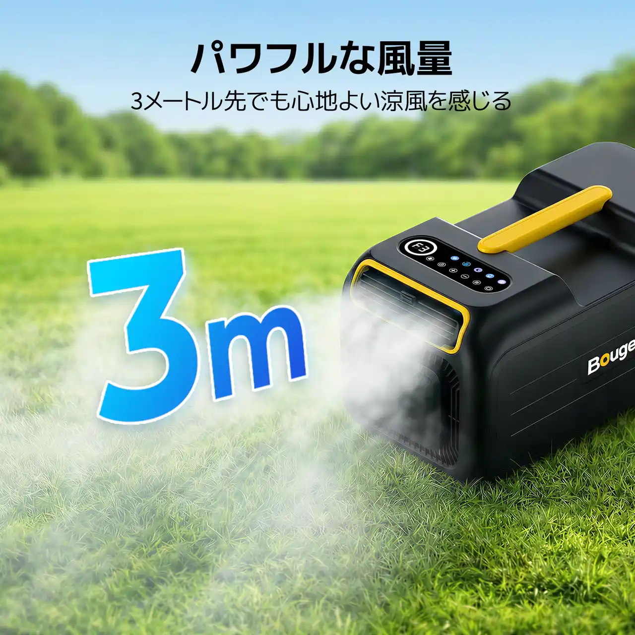 パワフルな性能を維持しながら、約55dBという低騒音化を実現しました。静寂が求められるキャンプ場の夜でも、稼働音を気にすることなくぐっすりと眠ることができます。自然の静けさを楽しみながら、涼しくリラックスした環境で質の高い休息を提供します。 |
