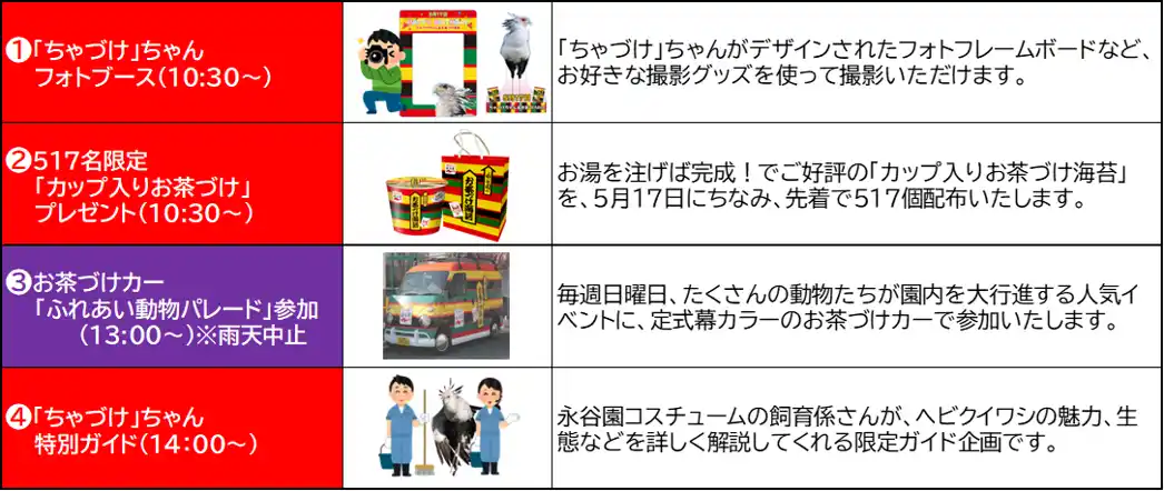 当日は、1.「ちゃづけ」ちゃん展示場付近でのフォトブース設置 2.先着517名様限定「カップ入りお茶づけ」プレゼント 3.園内で行われる動物パレードに定式幕デザインのお茶づけカーで参加4.飼育係による「ちゃづけ」ちゃん特別ガイド を行います。 |