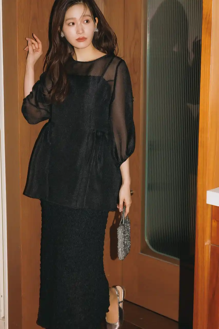 ブラックのオーガンジーのブラウスはシックで華やかな雰囲気を演出し、 |