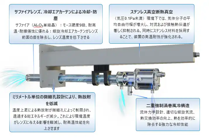二重ボルテックス空冷構造: 2,000℃に達する炉内でも内部機器を保護。 |