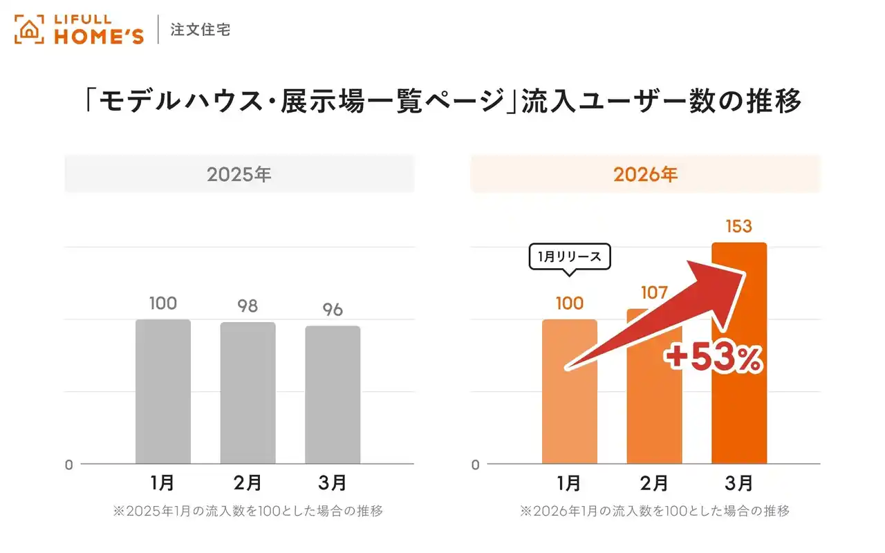 サイトリニューアル後の2026年1~3月において、LIFULL HOME'S 注文住宅の「モデルハウス・展示場一覧ページ」への流入ユーザー数は増加し、1月から3月にかけて+53%と大幅に伸長しました。また、「モデルハウス詳細ページ」への遷移率は同期間で+62%と大きく上昇しました。 |