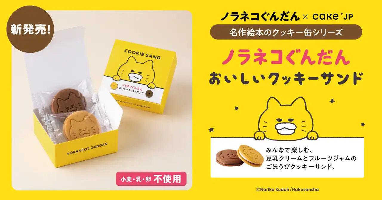 ケーキ・スイーツ専門通販サイト「Cake.jp(ケーキジェーピー)」を運営する株式会社Cake.jp(本社:東京都新宿区、代表取締役:高橋 優貴)は、好奇心と行動力に溢れているノラネコぐんだんが巻き起こす大騒動の絵本『ノラネコぐんだん』シリーズとコラボレーションしたクッキーサンドを2026年4月27日(月)よりCake.jpサイトにて販売いたします。また、阪神百貨店梅田本店、渋谷スクランブルスクエアで開催するポップアップストア「名作絵本のクッキー缶セレクション by Cake.jp」でも取り扱いいたします。 |