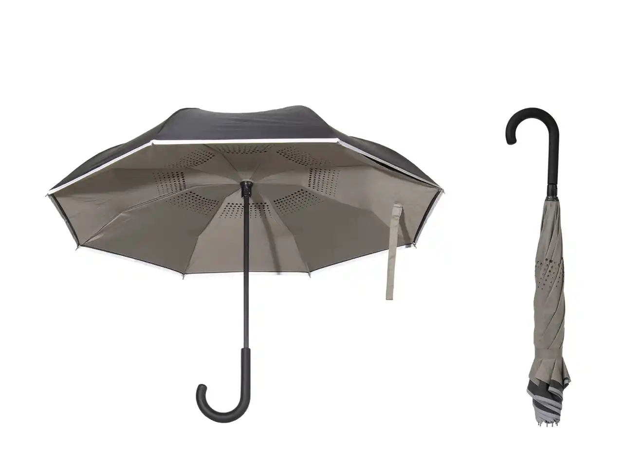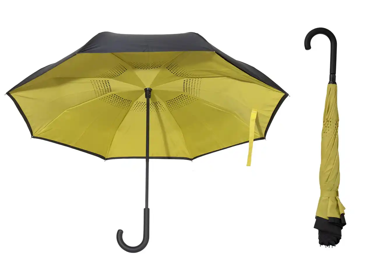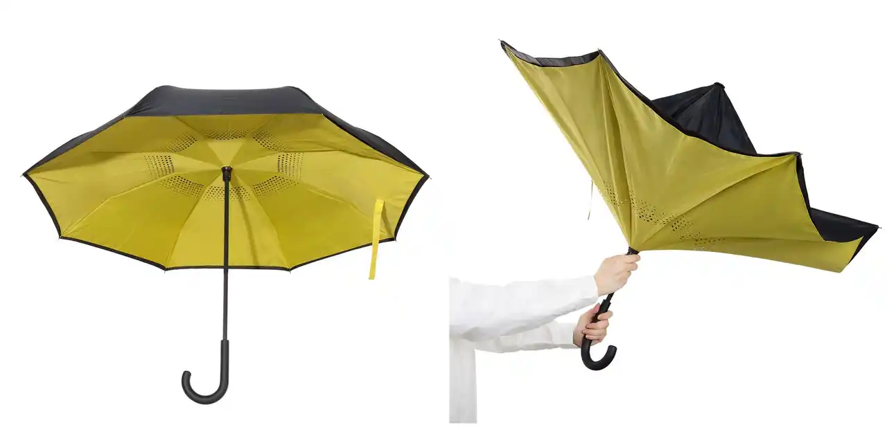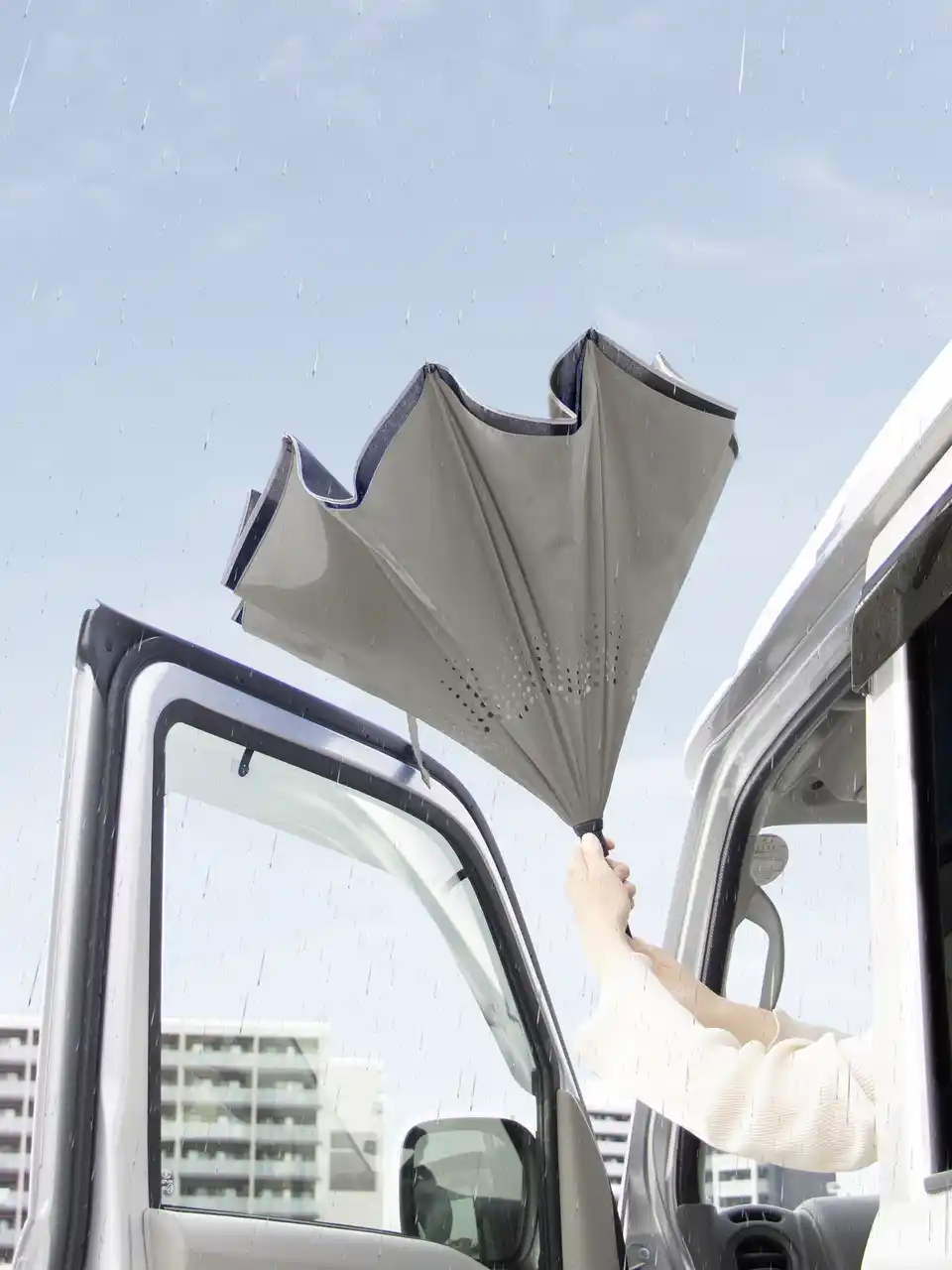 | たたむと濡れた面が内側に!自分も周りも濡らさない『逆とじ傘 (ぎゃくとじかさ)』 |